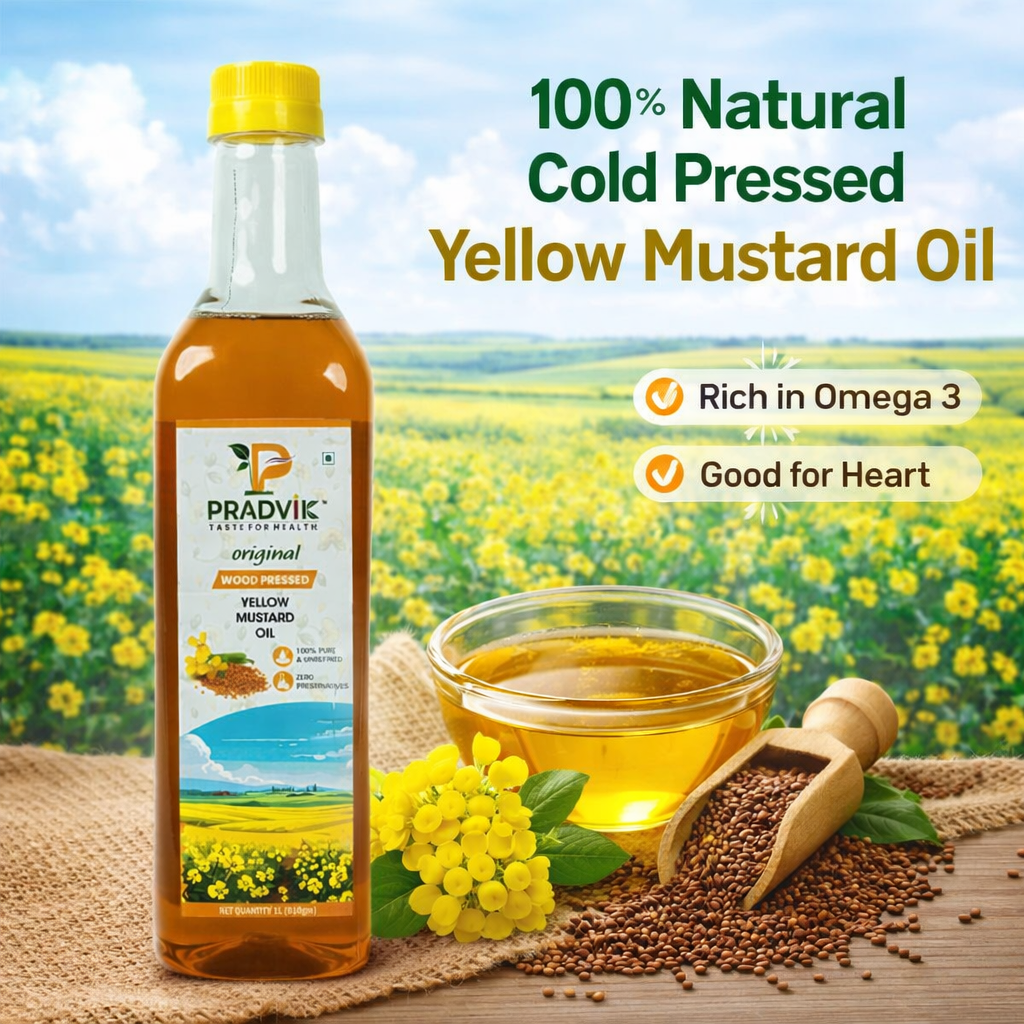 At Pradvik Food and Agro Private Limited, our mustard oil is extracted using the traditional wood-pressed (kachchi ghani) method—a time-honored process that respects both nature and nutrition.